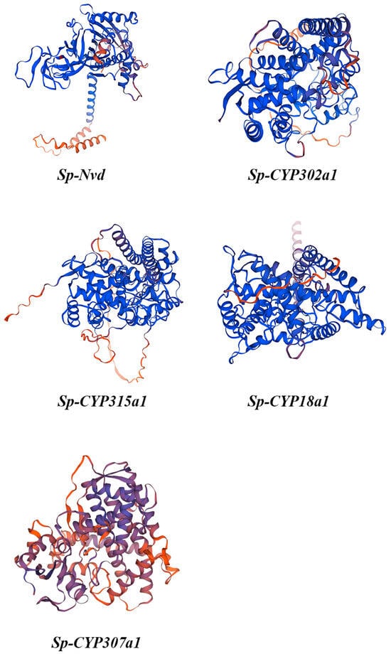 The Neverland protein has an α-helix content of 34.56%, with the highest random coil content at 44.06%, indicating a relatively flexible structure that may facilitate dynamic protein–protein interactions. In contrast, CYP307a1, CYP315a1, and CYP302a1 exhibit higher α-helix contents of 42.66%, 48.78%, and 45.85%, respectively, suggesting greater structural stability and regularity. Notably, CYP315a1 has the highest α-helix content at 48.78%, with relatively low proportions of β-turn and random coil, indicating a more rigid structure that may be associated with its stable enzymatic activity in the ecdysone pathway. Similarly, CYP18a1 shows an α-helix content of 47.81%, comparable to CYP315a1, indicating a high degree of regularity and stability in its secondary structure (Table 4).