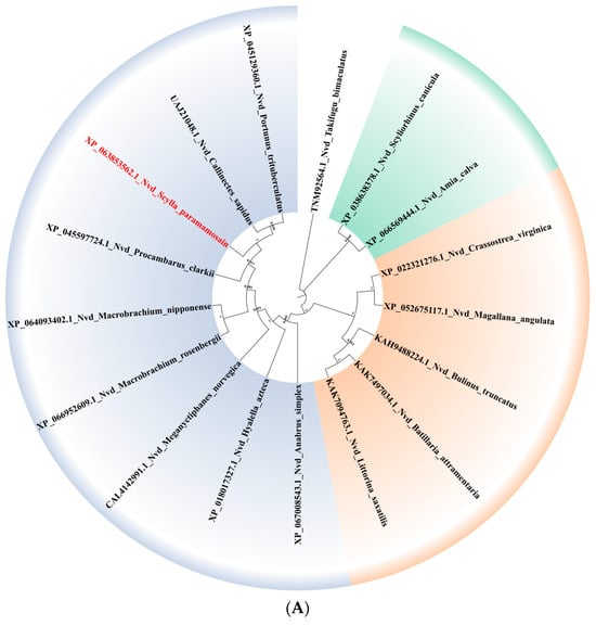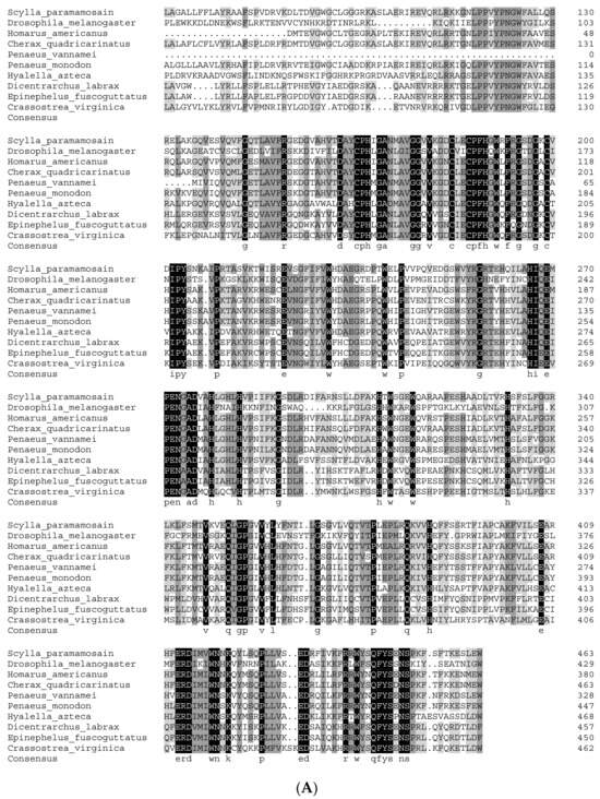 Genes which might be involved in 20E metabolism were firstly identified using the gene annotation information from the protein coding gene database, which was predicted and built by both transcriptome and genomic data. For those genes which could not be identified, we used the local blast method that uses the orthologs from the Drosophila melanogaster as the query sequences, which were downloaded from the KEGG database. In addition, TreeFam [] ortholog genes identification was also used to examine the presence or not in other animals’ genomes, including Daphnia pulex [], E. sinensis [], P. trituberculatus [], S. paramamosain [], and Litopenaeus vannamei []. Protein coding gene datasets of these species were download from the NCBI genome database (https://www.ncbi.nlm.nih.gov/datasets/genome/, accessed on 28 March 2024) or the GWH database (https://ngdc.cncb.ac.cn/gwh/, accessed on 28 March 2024). All identified genes were blasted again in the Non-Redundant Protein Sequence Database and InterPro database to verify their function annotation results. The CDS sequences of these genes identified in the mud crabs were verified using the PCR and sanger sequencing, and the primers are provided in Table 1.