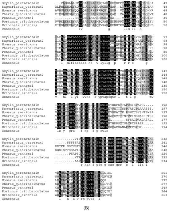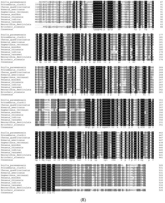 The amino acid sequences used in the multiple sequence alignment are listed in Table S1. Multiple sequence alignment analyses revealed that the amino acid sequence of Sp-Nvd has the highest homology with Penaeus vannamei, at 70%, followed by Penaeus monodon and Hyalella azteca, with homologies of 67% and 58%, respectively (Figure 2A). The amino acid sequences of Sp-CYP315a1 show the highest similarity with Sagmarisus verreauxi at 91%, followed by Homarus americanus and Cherax quadricarinatus, with homologies of 56% and 46%, respectively (Figure 2B). The amino acid sequence of Sp-CYP307a1 shows the highest homology with P. trituberculatus, followed by E. sinensis, with homologies of 84% and 57%, respectively (Figure 2C). The amino acid sequence of Sp-CYP302a1 has the highest homology with P. trituberculatus at 65%, followed by E. sinensis and P. vannamei, with homologies of 64% and 63%, respectively (Figure 2D). The amino acid sequence of Sp-CYP18a1 shows the highest homology with Procambarus clarkii, followed by C. quadricarinatus, with homologies of 52.04% and 45.16%, respectively (Figure 2E).