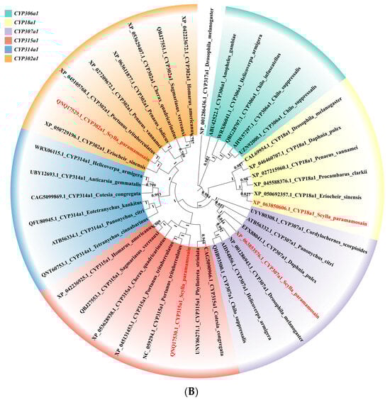 The sequence alignment results show that the homology of the mud crab (S. paramamosain) CYP18a1 and CYP307a1 genes with those of D. melanogaster is relatively low, at 39.60% and 49.44%, respectively. Typically, such a low homology indicates that these genes may have undergone functional diversification during evolution. A phylogenetic analysis reveals that these two genes are located on different branches, distant from the CYP gene clade of D. melanogaster and other insects, suggesting a significant divergence in their functional roles across species. CYP307a1 is closely associated with the regulation of ecdysteroids in some arthropods. Although its primary role may be in ecdysteroid biosynthesis, studies have also shown that it plays a critical role in the metabolic balance of these hormones. Specifically, in crustaceans, the regulatory pathway involving the CYP307a1 gene suggests its involvement in feedback mechanisms that regulate the degradation or metabolism of ecdysteroids during the molting process. This indicates a possible shift from its role in synthesis towards functions related to hormonal homeostasis []. CYP18a1 is closely linked to the degradation of 20-hydroxyecdysone (20E) in insects and other arthropods. This gene plays a crucial role in regulating ecdysteroid hormone levels, particularly by degrading 20E to control its concentration during specific developmental stages. In many insects, CYP18a1 is considered one of the primary enzymes involved in the metabolism of ecdysteroids, directly impacting the molting process. By modulating the concentration of 20E, CYP18a1 ensures that hormonal levels are appropriate for the insect’s developmental stage, thereby influencing growth and other critical physiological processes [].