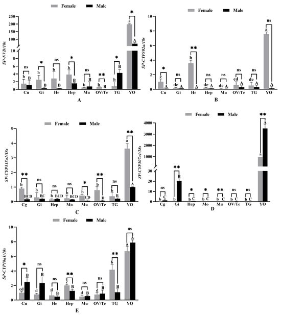 The results of the relative expression of genes in different tissues. Note: Hep: hepatopancreas; YO: Y-organ; Mu: muscle; Gill: gill; Cu: cuticle; TG: thoracic ganglion; He: hemocytes; OV: ovary; Te: testes. “*” indicates significant difference between the same or related tissues in different gender (p < 0.05); “**” indicates extremely significant difference between the same or related tissues in different gender (p < 0.01); “ns” indicate no significant difference. (A–E) Different lowercase or uppercase letters indicate significant differences among the different tissues in the same gender.
