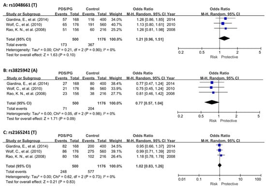 Meta-analyses were conducted for each SNP reported in two or more cohorts. PDS and PG were grouped as a single phenotype for analysis purposes. We employed an allelic model to assess genetic associations, calculating summary ORs and 95% CIs for each polymorphism using a random-effects model. Heterogeneity among studies was quantified using the I2 statistic [], with an I2 value below 25% indicating low heterogeneity. Meta-analyses were performed and relevant plots were generated using Review Manager 5 (RevMan 5). We considered summary p-values less than 0.05 as indicative of statistical significance.