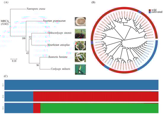 Phylogenetic relationships and population structure of C. militaris. (A) Phylogenetic relationships based on single-copy genes; (B) phylogenetic relationships based on SNPs; (C) population structure.