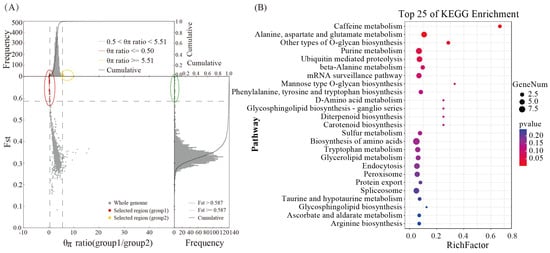 Selecting elimination analysis to explore functional genes related to cordycepin metabolism. (A) Analysis of selection and elimination of high- and low-cordycepin groups. (B) KEGG enrichment of selected genes.