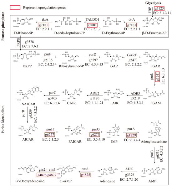 The transcriptome functional enrichment analysis showed that metabolic pathways, biosynthesis of secondary metabolites, aminoacyl tRNA biosynthesis, glyoxylate, and dicarboxylate metabolism were enriched, and various amino acid synthesis and metabolism were all enriched. Regarding selecting upregulated genes of selective elimination, these differentially expressed genes presented the significant enrichment of glycolysis, the pentose phosphate pathway, and purine metabolism among stages with low- and high-cordycepin content (Figure 4B). Additionally, the substantial enrichment of amino acid metabolism indicated a positive impact on the cordycepin synthesis []. Furthermore, focusing on genes of the adenosine synthesis pathway, expressions of adenylate kinase (g5449), adenosine kinase (g3376), adenylosuccinate synthetase (g1229), and adenosine deaminase (g2847, g3195) were observed in the high-cordycepin stage. In particular, the high expression of adenylosuccinate synthetase may facilitate the provision of adenosine and other precursor substances for the cordycepin synthesis [,].