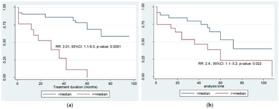The ratio of the combination of TNFα+IL6+TGFβ1/IL10+IFNγ gene polymorphism was computed, and a possible association with the probability of relapse-free survival was explored. Kaplan–Meier (Mantel–Haenszel model) estimates of the probability of relapse-free survival, for a gene expression ratio above the overall median, were relatively high (RR: 3.01; 95% CI: 1.1–8.3; p-value = 0.0261) (Figure 1a). The ratio of the results of IL6/IL10+TGFβ1 was computed. Similarly, subjects with a gene expression ratio above the overall median were 2.4 times more at risk for relapse during the period of TKI treatment (RR: 2.4; 95% CI: 1.1–5.2; p-value = 0.022) (Figure 1b). The effect of individual cytokine SNPs (ratio of IL6/IL10) was not statistically significant (RR: 0.445; 95% CI: 0.180–1.1; p-value = 0.072) nor was the ratio of IL6/TGFβ1 (RR: 0.013). Though patients with a higher than median gene expression (ratio of TNFα/IL10) had twice the risk for relapse, it was not statistically significant (RR: 1.92; 95% CI: 0.877–4.20; p-value: = 0.097). Regarding the ratio of IL6+TNFα/IL10, the relative risk of relapse is twice as high among patients with a higher than median gene expression profile (RR: 2.05; 95% CI: 0.94–4.46; p-value = 0.064), albeit not significant (Figure 1c). The ratio of IFNγ+TNFα/IL10, in patients with a gene expression profile above the median ratio, had twice the risk of relapse during the treatment period of 10 years or less (RR: 1.94; 95% CI: 0.89–4.23; p-value = 0.0876) (Figure 1d).