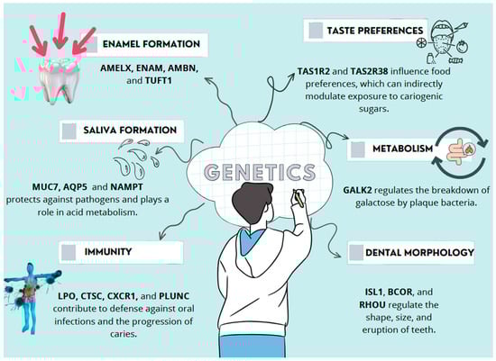 Genetic factors contribute to dental caries susceptibility through multiple biological mechanisms. These include genes involved in enamel and dentine formation, salivary composition, immune defence, taste perception, and metabolic regulation. Their effects are not independent; variations in one pathway may influence or exacerbate vulnerabilities in another. For example, weaker enamel structure combined with reduced salivary buffering or a strong preference for sugary foods can significantly increase caries risk (Figure 1) [,].