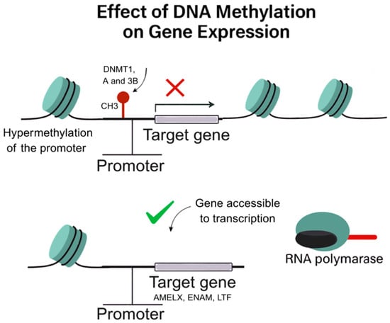 DNA methylation, one of the most extensively studied epigenetic marks, involves the addition of methyl groups to cytosine residues in CpG dinucleotides (Figure 3). This modification typically represses gene transcription, especially when located in promoter regions (Figure 4) []. In the context of dental caries, DNA methylation has emerged as a key mediator of environmental influences during critical developmental windows. The PETS study (Pregnancy and Epigenetics in Tooth Study) exemplifies this perspective. In a cohort of children followed from birth to 6 years, higher levels of DNA methylation in the promoter region of the Early growth response 1 protein (EGR1 gene), encoding a transcription factor involved in cell proliferation, were associated with an increased risk of early childhood caries (ECC). Notably, this methylation pattern was already established at birth in cord blood, suggesting in utero programming of oral health susceptibility [].
