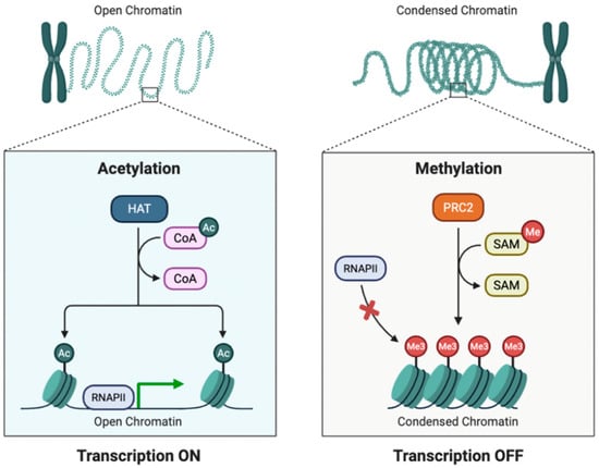 Illustration representing the mechanisms of post-translational histone modifications, including acetylation and methylation. On the left, acetylation by histone acetyltransferases (HAT) adds acetyl groups (Ac) to histone tails using acetyl-CoA (CoA) as a substrate. This modification reduces histone-DNA interactions, resulting in open chromatin structure that is accessible to RNA polymerase II (RNAPII), thereby promoting gene expression (Transcription ON). On the right, methylation is catalyzed by the Polycomb repressive complex 2 (PRC2) using S-adenosyl methionine (SAM) as a methyl donor, leading to tri-methylation (Me3) of histone tails. This promotes a condensed chromatin structure that inhibits RNAPII binding, thereby repressing transcription (Transcription OFF).