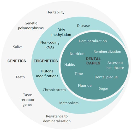 Part of this variability between individuals can be explained by genetics. Some people are naturally more susceptible to dental caries due to variations in their genes, which influence tooth quality, saliva composition, taste perception or the oral immune response. Slight differences in the expression or regulation of specific genes can be enough to make someone more vulnerable to acid attacks or bacterial colonisation [,,]. However, these genetic factors do not work alone; they constantly interact with the environment.