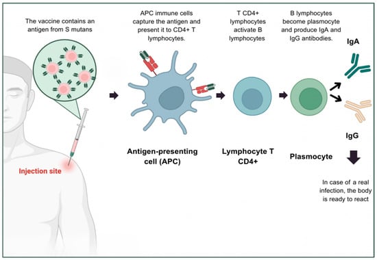 The vaccine approach is therefore based on inducing an adaptive immune response capable of recognising S. mutans early on and neutralising it before it colonises the enamel [,,,]. Unlike conventional vaccines targeting systemic infections, anti-caries vaccines mainly aim to strengthen local immunity in the oral mucosa, while mobilising certain systemic effectors (e.g., IgG in the gingival crevicular fluid). In this context, secretory Immunoglobulin A (sIgA), which is predominant in salivary secretions, breast milk, and gastrointestinal mucosa, plays a key role in local defence. Produced by plasma cells derived from activated B lymphocytes, it is generated from mucosal immunity-inducing centres, such as gut-associated lymphoid tissue (GALT), before migrating to the salivary glands [,,].