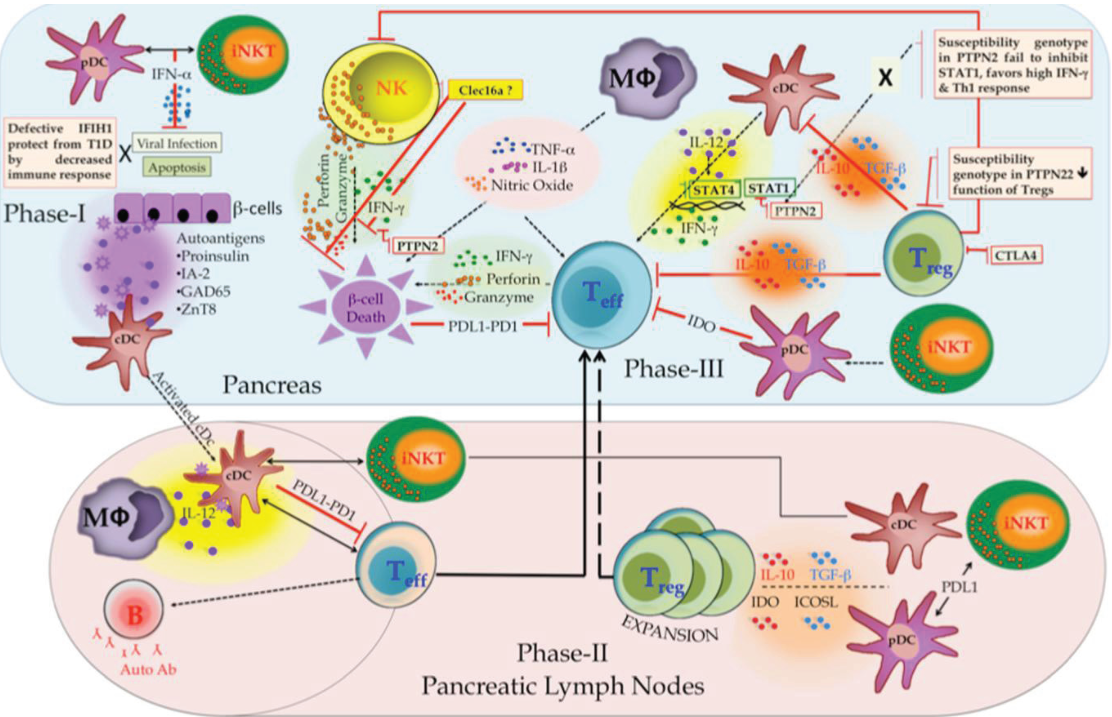 Phase III (immune cell crosstalk) occurs in the pancreas where β-cell can be killed by diabetogenic T cells (adaptive component) and NK cells (innate component) through the release of interferon-γ (IFNγ), granzymes, and perforin, as well as by macrophages through the production of tumor necrosis factor (TNF), IL-1β and nitric oxide (NO). IL12 produced by cDCs sustains the effector functions of activated diabetogenic T cells and NK cells. TReg cells that inhibit diabetogenic T cells and innate immune cells through IL10 and TGFβ can prevent β-cell damage. Tolerogenic pDCs stimulated by iNKT cells could also control diabetogenic T cells through IDO production. Lastly, β-cells can inhibit diabetogenic T cells by expressing PDL1 and escape the cell death [50,51].