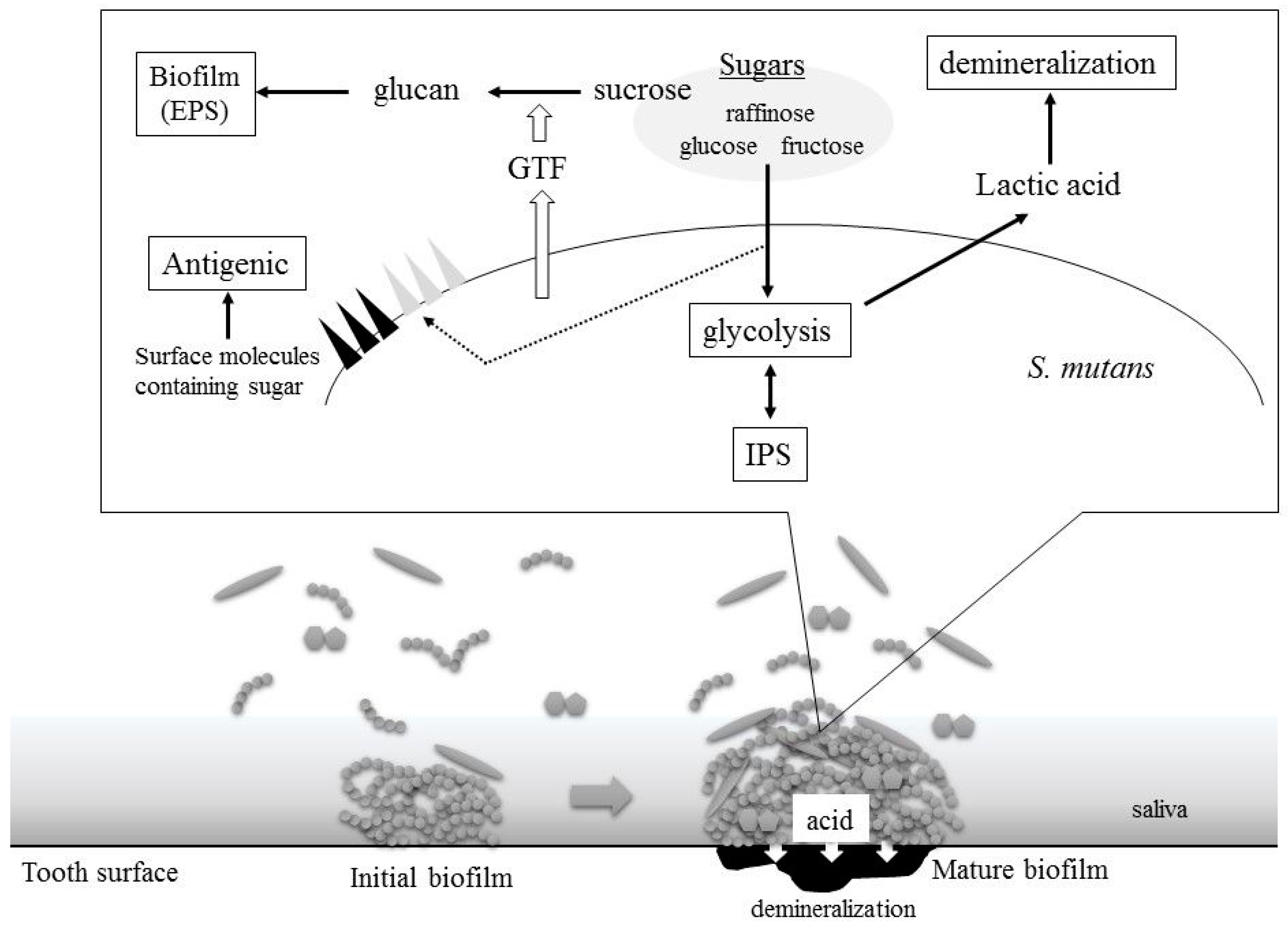 The strong association of dental plaques with tooth decay and periodontal diseases is well accepted. Dental plaque is also called a biofilm because dental plaque consists of many types of bacteria and their extracellular matrix (ECM) products. The major ECM component in dental plaque is a sticky, water-insoluble glucan produced by S. mutans. S. mutans produces three GTFs and synthesizes a sticky, water-insoluble extracellular glucan from sucrose as the sole substrate [16,17]. This glucan is a complex of water-insoluble (glucose polymer with an α-1,3 linkage) and soluble glucan molecules (glucose polymer with an α-1,6 linkage) termed mutan and dextran, respectively. This sticky glucan causes strong adhesion and bacterial aggregation on the tooth surface, facilitating biofilm formation. The glucan also serves as a stored carbon source in S. mutans. S. mutans produces dextranase to digest glucan (dextran) to glucose, which can then be utilized in glycolysis [18,19,20]. In addition, S. mutans produces fructosyltransferases for the production of a fructose polymer known as fructan, which is a water-soluble polysaccharide.