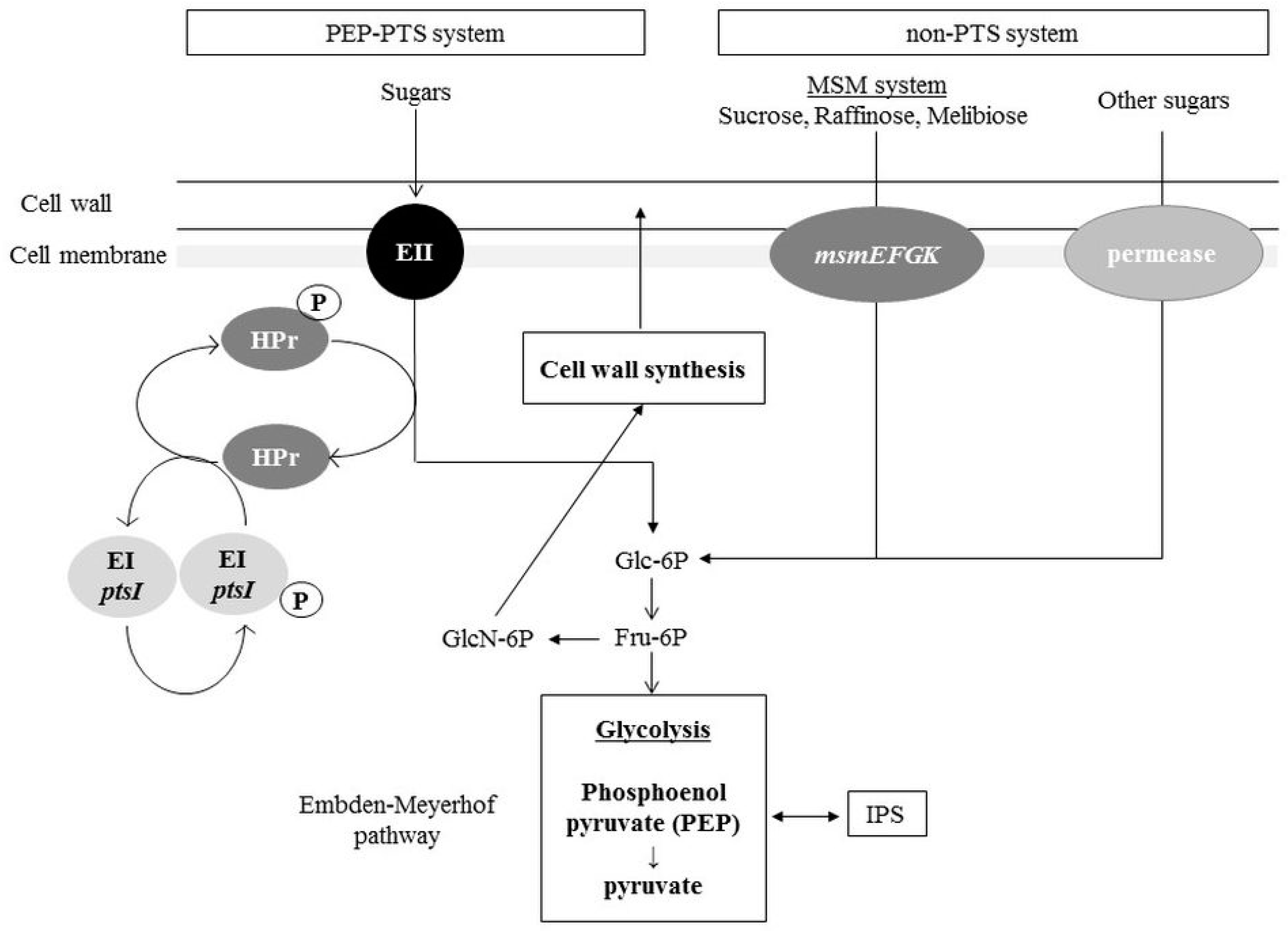 Phosphotransferase (PTS) and non-PTS system in S. mutans. Bacteria can take up carbohydrates by specific sugar incorporation systems. In S. mutans, two major incorporation systems, the PTS and non-PTS systems, have been reported. After sugars are incorporated into cytoplasm, the sugar molecule is processed and finally metabolized to fructose 6-phosphate (Fru-6P). Fru-6P is distributed to glycolysis and the cell wall synthesis system. EI: Enzyme I; EII: Enzyme II; MSM: multiple sugar metabolism; msmEFGK: multiple sugar metabolism transporter; Glc-6P: glucose 6-phosphate; GlcN-6P: glucosamine 6-phosphate; HPr: histidine phosphocarrier protein.