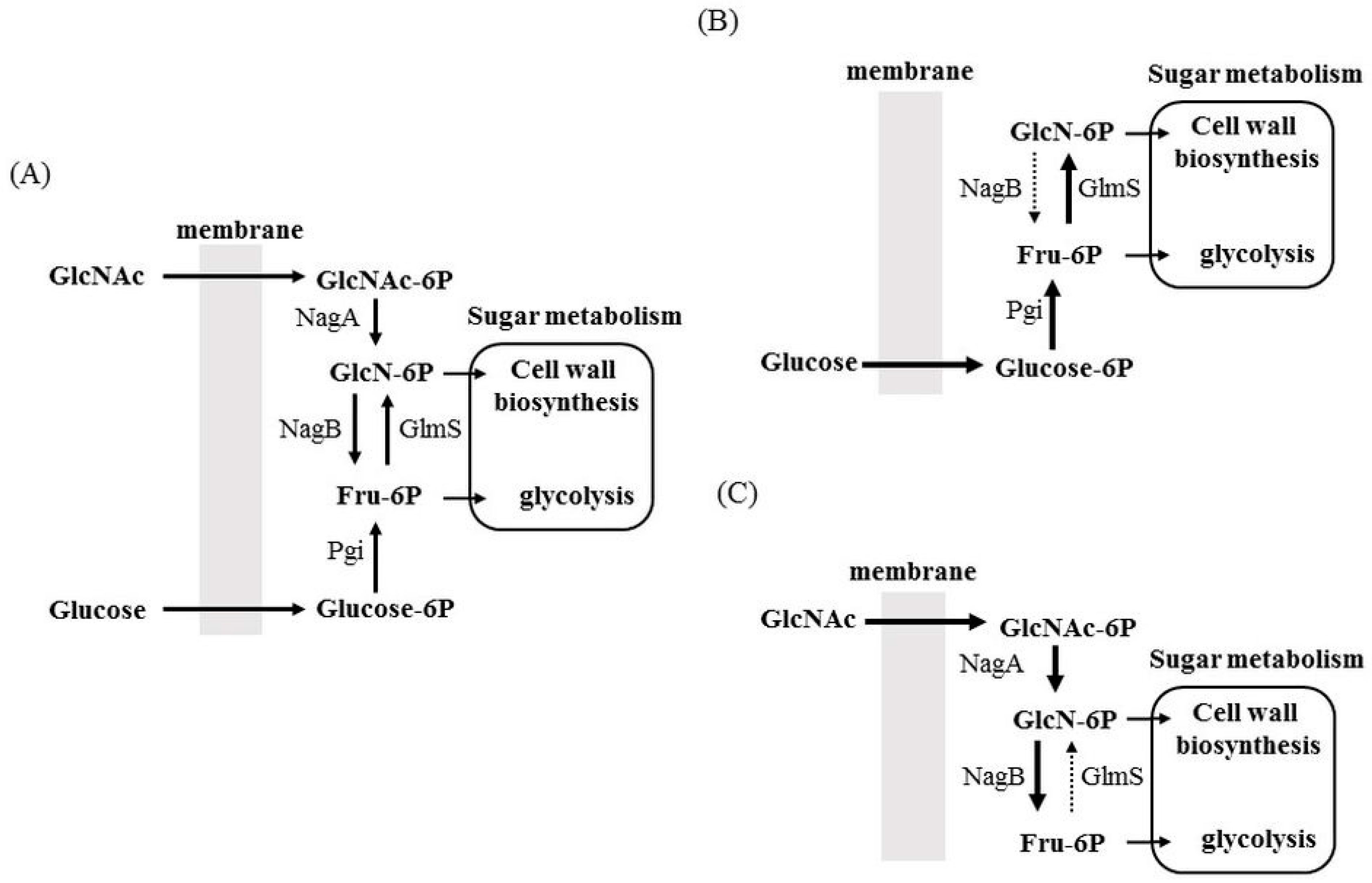Proposed sugar distribution mediated by glutamine-fructose-6-phosphate aminotransferase (GlmS) and glucosamine-6-phosphate deaminase (NagB). (A) In the presence of sugar (glucose) and amino sugar (GlcNAc), both sugars are incorporated into the cytoplasm and are distributed to cell wall synthesis and glycolysis by GlmS and NagB; (B) In the presence of glucose as a sole carbohydrate source, NagB expression is significantly suppressed to generate enough GlcN-6P for the cell wall biosynthesis pathway; (C) In the presence of GlcNAc as a sole carbohydrate source, GlmS expression is significantly suppressed to generate enough Fru-6P for glycolysis pathway. GlcNAc: N-acetylglucosamine; GlcNAc-6P: N-acetylglucosamine 6-phosphate; GlcN-6P: glucosamine-6-phosphate; Fru-6P: fructose 6-phosphate; glucose-6P: glucose 6-phosphate; NagA: N-acetylglucosamine 6-phosphate deacetylase; Pgi: glucose 6-phosphate isomerase.