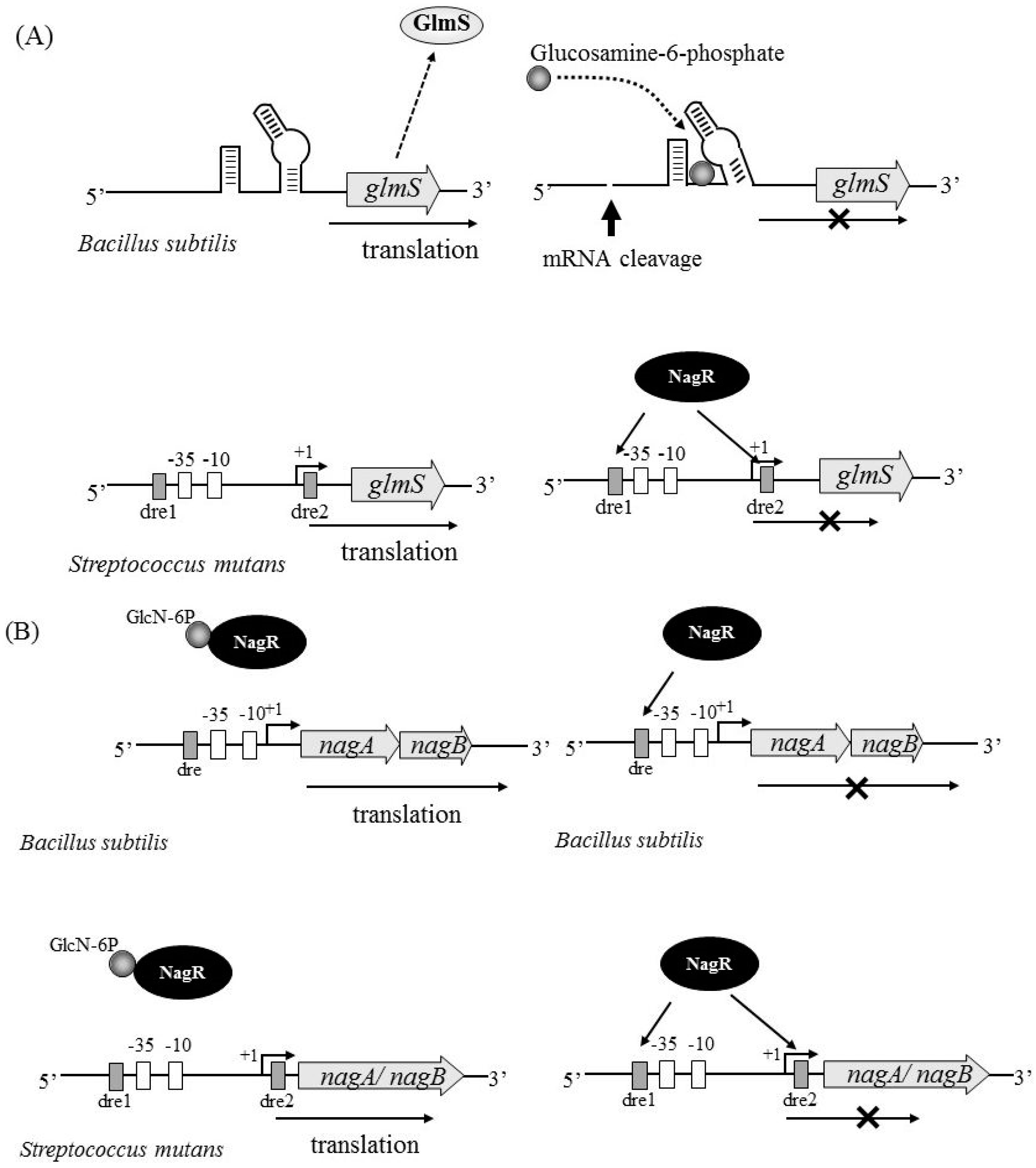 Regulation of glmS and nagAB expression in Bacillus subtilis and S. mutans. (A) The regulation of glmS in B. subtilis (upper) and S. mutans (lower) is shown. B. subtilis glmS transcript has ribozyme activity, which causes self-cleavage in the presence of excess glucosamine-6-phosphate, a product of the GlmS reaction. GlmS of S. mutans is negatively regulated by NagR. NagR binds to the DasR responsive element (dre) sequence upstream of the glmS coding region, leading to inhibition of the glmS transcript; (B) Regulation of nagAB in B. subtilis (upper) and S. mutans (lower) is shown. In B. subtilis, nagA and nagB are tandemly located to form an operon, while nagA and nagB are independently located in S. mutans. NagR binds to the dre sequence upstream of nagAB in B. subtilis, leading to inhibition of the nagAB expression (upper right). However, NagR bound with GlcN-6P has no ability to bind to the dre sequence (upper left). The same regulation system is observed in nagA and nagB in S. mutans (lower left and right).