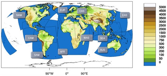The ten CORDEX-CORE model domains simulated by the model REMO: North America (NAM), Central America (CAM), South America (SAM), Europe (EUR), Africa (AFR), South Asia (formerly referred to as West Asia, WAS), Central Asia (CAS), East Asia (EAS), Southeast Asia (SEA), and Australasia (AUS). The orography is shown in m. The domain boundaries are indicated with black polygons.