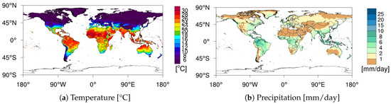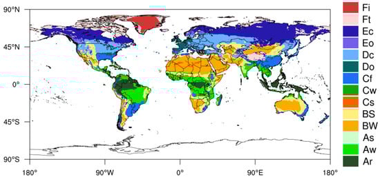 The analysis regions considered in this study were defined using the Köppen–Trewartha (K–T) Climate Classification []. The fourteen climate types (Table 2) were derived using the mean annual temperature (, in C) and the mean annual precipitation (, in cm) of a 30-year climatology from an observational dataset. For climatology, we used the Climatic Research Unit (CRU) temperature and precipitation version CRU TS 4.02 dataset []. This version utilized a revised interpolation function improving discontinuities in regions with sparse observations for the period 1901–2017. The spatial coverage included all land areas excluding Antarctica at 0.5 resolution. The climate period considered in this study was from 1981 to 2010.