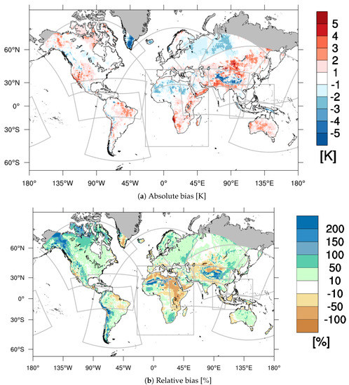 The setup for each model domain in Table 1 were based on the best expert knowledge for the respective regions. For example, due to sensitivity studies in South America and in the South Asia domains, some surface parameters were modified. In South America, it was found that the warm bias in forested regions were reduced due to reduction of surface evaporation when the wilting point parameter was lowered in forested regions compared to non-forested regions []. In the South Asia domain, the soil heat conductivity was reduced to represent the dry soils, which improved the representation of climate especially over India [].