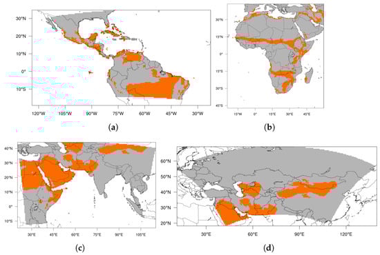 Examples of climate type regions. The orange area indicates the location of each climate type in its respective domains. (a) Winter dry tropical climate (Aw) in Central America (CAM); (b) Semi-arid dry climate (BS) in Africa (AFR); (c) Arid climate (BW) in South Asia (WAS); (d) BW in Central Asia (CAS).