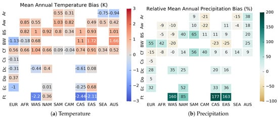 Based on the results from the previous section, the temperature and precipitation biases of the model were aggregated according to regions with similar climate types (Figure 4) for each domain. Figure 6 shows the mean annual bias aggregated at each climate regions in each of the ten domains. The annual bias for temperature (Figure 6a) ranges from −2.2 to 1.7 K. The bias over EUR is relatively low from −1.1 to 0.5 K. The coldest bias of about −2 K occurred in the tundra (FT) climate regions in the WAS, EAS, and CAS domains and within the observed temporal STD and spatial STD of the bias (Table 3). Similarly, the case of the warmest bias (about 1.7 K) is located in the semi-dry arid (BW) climate regions in the EAS and AUS domains. In this BW climate regions, except for EUR (cold bias, approx. −1.1 K) and AFR (low cold bias, approx. −0.2 K), the model produces a warm bias to the rest of the domains (WAS, CAS, EAS, and AUS). For arid regions (BS), all domains with this climate type have biases ranging from 0.34 K (CAM) to 1 K (WAS, AUS). In domains with similar climate types (e.g., Cf—subtropical humid climate), the model produces a warm bias in both the CAS and SEA domains, which will be a possible study on the overlapping regions.