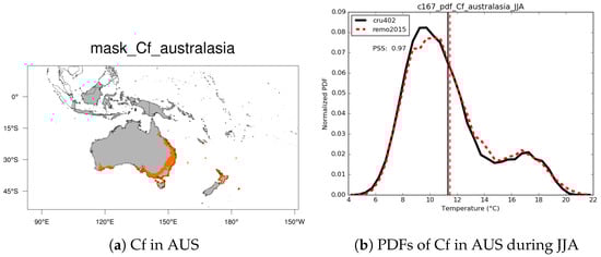 (a) Sample of a climate type mask and (b) its normalized temperature probability density functions (PDFs) in a subtropical (Cf) climate type at Australasia (AUS) domain during June-July-August (JJA) for the period 1981 to 2010. The PDF skill score of 0.97 is indicated in the normalized PDF, and the vertical lines indicated the mean of the observed (black line) and simulated (red dashed line) distributions.