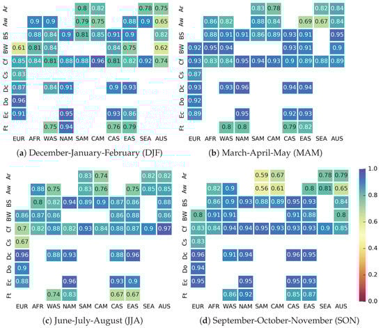 Temperature skill scores based on the probability density functions (Skillseasons) of REMO compared to CRU during the four seasons (DJF, MAM, JJA, SON) for the period 1981 to 2010. The x-axis are the domains (Figure 1) while the y-axis are the climate types (Table 2). The unit is dimensionless.