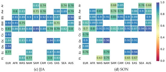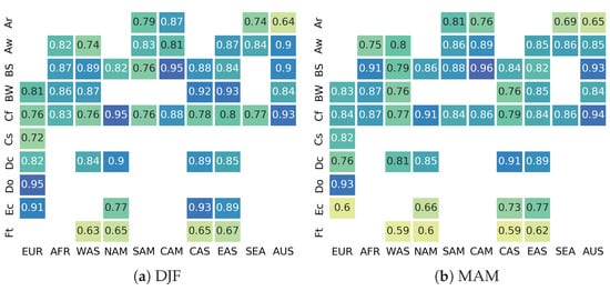 The skill of the model in simulating the precipitation decreased compared to the temperature skill scores. More than ten regions have relatively low skills (less than 0.8) with eighteen regions during MAM (Figure 9b). The model has a low skill in tropical humid (Ar) and tundra (Ft) climate regions, especially in terms of precipitation.
