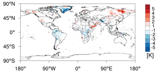 The biases of ERA-Interim compared to CRU ranges from −5 to +5 K. The warm biases are located in Namib Desert in Africa, coasts of Yemen and Oman, and the eastern regions of Russia. In these regions of Russia, the station density is low []; hence, the biases are due to observational uncertainty. The cold biases of ERA-Interim compared to CRU are located in central regions of the African continent, the Himalayas, Indonesia, Bolivia, northern regions of South America, and Greenland. In some cases, the stations used in CRU were insufficient reproducing a known bias such as in the Namib Desert, near the coast of Africa []. The location of these biases are useful, however, in identifying the regions where the REMO simulations have inherent biases from their input driving fields.