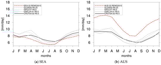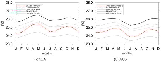Mean annual temperature cycles for tropical humid (Ar) climate type in SEA and AUS for the period from 1981 to 2010. The CRU and other observational (GLDASD, UDEL) and reanalysis (ERAINT) datasets are depicted with black and gray lines. The REMO model (SEA-22/AUS-22 REMO2015) are shown with red lines. The dashed lines indicate similar native resolution (0.22 and 0.25).