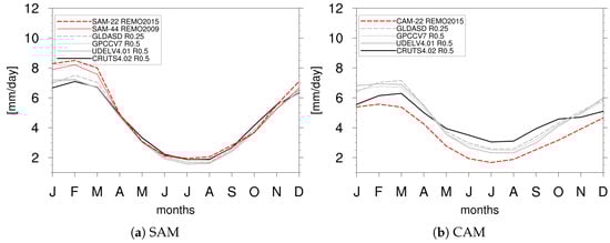 In a tropical with dry “winters” climate (Aw, e.g., CAM in Figure 5a and SAM), the input boundary forcing has a cold mean annual bias in the northern region of South America (Figure 10); however, REMO tends to simulate a warm mean annual bias in both SAM and CAM domains (Figure 6a). Compared to the previous CORDEX study (SAM-44), the CORDEX-CORE simulation (SAM-22) follows the same mean annual cycle of temperature and both SAM-22 and SAM-44 simulations have a warm bias of almost 2 K during austral spring from September to November (figure not shown). Although the land surface parameters were adjusted [] to represent the Amazon conditions, REMO missed representing the region. This misrepresentation of the land surface conditions could be solved in future studies by using a dynamic vegetation scheme []. In addition, REMO has a wet (Figure 13a) bias in SAM only during January to March while it has a slightly dry (Figure 13b) bias in CAM throughout the year. The opposing wet and dry biases in SAM and CAM (Figure 13), respectively, are possibly due to the different latitude-dependent parameters of the two domains (Table 1). In the SAM domain, the wet bias occurs, especially during the austral summer (DJF), where mesoscale convective systems are more active [].