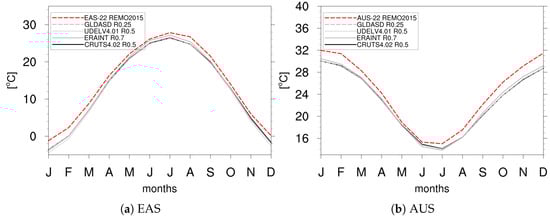 Mean annual temperature cycles for arid (BW) climate type in EAS and AUS. The CRU and other observational (GLDASD, UDEL) and reanalysis (ERAINT) datasets are depicted with black and gray lines. The REMO model (EAS-22/AUS-22 REMO2015) is shown with red lines. The dashed lines indicate similar native resolution (0.22 and 0.25). Monthly values are averaged over the period from 1981 to 2010.