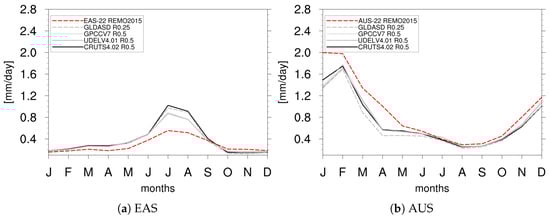 In the regions with the arid (BW) climate type or desert regions, REMO has the warmest biases in EAS and AUS as shown in Figure 6a. This warm bias in this climate type region occurred throughout the year (Figure 14). One possible source of this bias is the warm bias of the driving field (ERA-Interim) compared to CRU especially during summer (JJA in EAS and DJF in AUS). A study investigating the CORDEX-Australasia RCM ensemble at 50 km using the Australian Gridded Climate Data [] showed that most models in the AUS domain show a cold bias in the daily maximum temperature (ensemble mean of about −1 to −2 K), while the daily minimum temperature was mainly overestimated with some exceptions []. A mean temperature comparison was not made due to the limitations of the observational dataset, but the REMO results over Australia were comparable within the range of other RCMs.