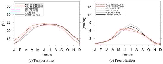 The model performance of REMO2015 in regions with similar climate types were evaluated in terms of the model biases (Figure 6) and skill score based on probability density functions (Figure 8 and Figure 9). The sources of biases in each climate type regions were investigated and categorized to systematic errors due to missing or misrepresented atmospheric processes or due to observational uncertainty. To explain further the sources of these biases, the mean annual cycles of the current REMO2015 simulations were compared with CRU and other observational datasets available (GLDASD, GPCC, UDEL, and ERAINT). In addition, the previous CORDEX simulations from the old domains (EUR-44, EUR-11, AFR-44, WAS-44, NAM-44, and SAM-44) were compared to the new CORDEX-CORE domains (EUR-22, AFR-22, WAS-22, NAM-22, and SAM-22).