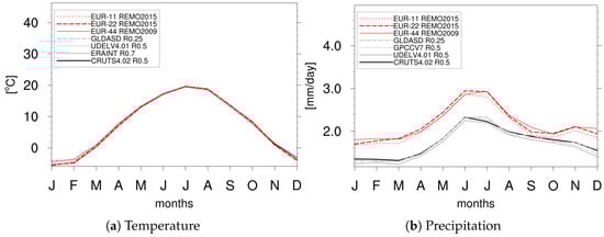 Mean annual temperature and precipitation cycles for temperate continental (Dc) in EUR for the common period from 1989 to 2008. The CRU and other observational (GLDASD, GPCC, UDEL) and reanalysis (ERAINT) datasets are depicted with black and gray lines. The REMO model (EUR-44 REMO2009 and EUR-11 REMO2015) is shown with red lines. The dashed lines indicate similar native resolution (0.22° and 0.25°). The dotted line indicate the highest spatial resolution of 0.11°.