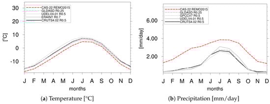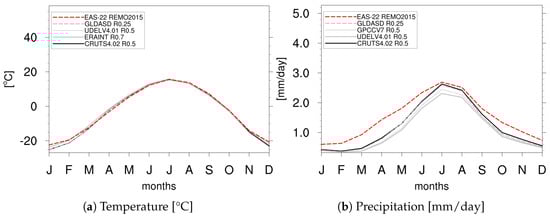Mean annual temperature and precipitation cycles for boreal (Ec) climate type in EAS for the period from 1981 to 2010. The CRU and other observational (GLDASD, GPCC, UDEL) and reanalysis (ERAINT) datasets are depicted with black and gray lines. The REMO model (EAS-22 REMO2015) is shown with red lines. The dashed lines indicate similar native resolution (0.22° and 0.25°).