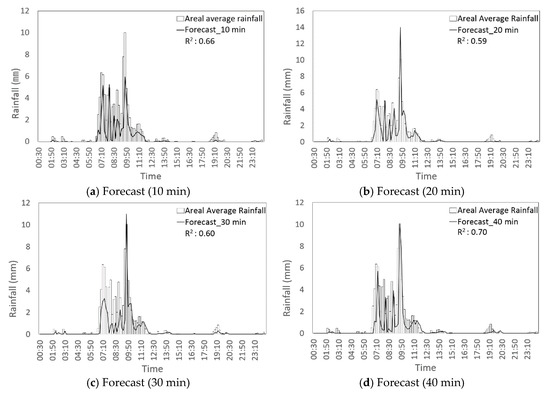 Rainfall forecasting results by radar in the very short-term inundation prediction were applied. This module generated the forecasting rainfall with from 10 min to 120 min lead time for the Automatic Weather station (AWS) 8 points of KMA near Dorim basin. After that, it converted to the areal average rainfall and the accuracy of forecasting results was compared with that of AWS rainfall data on 26 July 2019 (Figure 9). As a result, the forecasting results until 70 min were good predicted, the accuracy from 80 min began to decrease sharply. Among these forecasting results, the 40 min forecasting rainfall result predicted by radar was applied to the simplified rainfall–runoff model to calculate the stream depth and accuracy of analyzed results was examined. The analysis points were selected as the water level stations in Dorim basin (Seoul University, Sillim3 bridge, Gwanak Dorim bridge, Guro Digital Complex station, and Guro1 Bridge). Figure 10 shows that analyzed stream depth results were compared with the data of water level stations on 26 July 2019. Table 5 makes the comparison of performances of SWNN rainfall–runoff model for stream depth prediction. This is the quantitative analysis of the SWMM model using four preference criteria. Due to the characteristics of predicted rainfall results by radar, which did not predict the initial rainfall well, R2 and NSE of the upstream where Seoul University is located were relatively low, but the predictive performance of the downstream, Gwanak Dorim, and Guro 1 bridge was 0.80 and 0.81, respectively, at 40 min lead time which presented good prediction performance. After 50 min lead time, the values of MAE and RMSE are all increased sharply. These cases illustrate that the 40 min lead time is the most appropriate time to forecast and warn urban flooding.