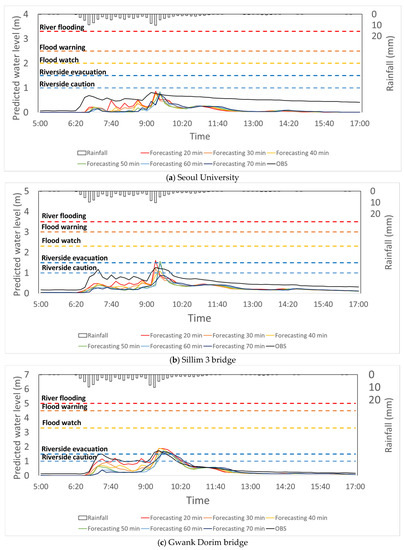 Tributaries inflow have a substantially influence on forecasting results of water level by LSTM. Therefore, we have constructed the training sets with various input combinations to consider tributaries inflow. They showed the training group due to water level data (Table 4) and the accuracy of the forecasting result. The module of the short-term inundation prediction was carried out with LSTM on 26 July 2019. The forecasting results for Cases 1, in which training was performed using only one upstream depth data, did not reflect good forecasting model performance because other streams flow into Dorim stream. However, the forecasting results obtained with depth data of two points, case 2 showed better accuracy than case 1 result. Moreover, the forecasting results for Case 3, which involved the training with depth data of three points, indicated the best performance. It means that tributary data is very important to predict downstream depth in Dorim basin. Case 3 also presented that if sufficient depth data are acquired and the data quality is improved, the forecasting result based on depth data can reflect sufficiently good performance. Through these results, the LSTM with training three points water level stations was selected as forecasting model of short-term inundation prediction module. After quantitative and qualitative analysis of LSTM, we also scatter the observed and simulated water level values (Figure 8). The values LSTM R2 are 0.9695, 0.9653, and 0.9823, respectively due to lead time. The LSTM has high values of R2 indicating that this model could well reflect the relationship between observed and forecasting depth so that forecasting model with lead time 90 min is quite possible to predict and warning stream flooding. It is sufficiently can warn and evacuate the resident if accurate water level prediction with 90 min lead time is led in flash rainfall.