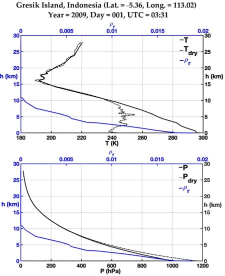 Vertical profiles of real temperature  and dry temperature (top), and real pressure  and dry pressure  (bottom), together with mixing ratio  for a RO taking place at Gresik Island, Indonesia, on 1 January 2009.