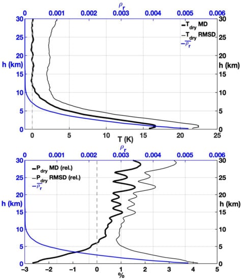 From Figure 3 we observe that the mean values of the water vapor mixing ratios  showed an exponential trend varying with altitude, with non-negligible mean values starting from 10–11 km that increased up to ~5 × 10−3 toward the surface. As far as the temperatures were concerned, almost no biases between real and dry temperature were present at altitudes above ~11 km, while below such values, when water vapor concentrations became non-negligible, MD (and RMSD) monotonically increased up to ~15 K (22 K). For pressures, things were more complicated, since we registered positive biases between data from radiosondes and data from ROs at high altitudes (30 km). Such biases, having different sources than the water vapor, which is absent at those altitudes, showed a decreasing trend even if with an irregular pattern. The water vapor effects on this trend seemed to start at ~8 km, when the pendency of the pattern further decreased (that is, MDs decreased more rapidly below 8 km); besides, the RMSDs inverted the trend and started to increase for altitudes below ~7 km.