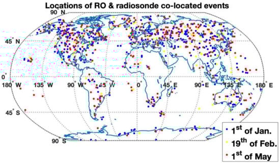 where  from now on will denote the number of samples. Temperature and pressure corresponding to given altitudes are obtained via linear interpolation for both the RO and balloon profiles. RO observations come from FORMOSAT-3/COSMIC-1 mission [], they occurred in 2009 (see Figure 4 for location and date of the events), with the colocated balloon data [] from the RAwinsonde OBservation (RAOB) program []. Colocated events were selected by requiring the following conditions: (1) RO profiles with impact parameters falling below an altitude of 10 km from the Earth’s surface; (2) radiosonde excursions reaching altitudes above 21 km; (3) radiosonde excursions without data lacking in their profiles.