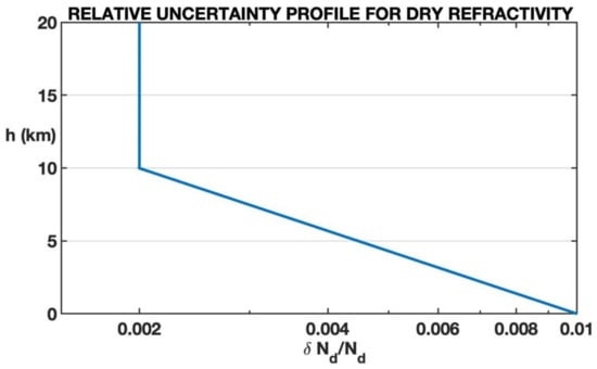 The second one is a relative estimation and comes from a schematized version of the relative uncertainty profile reported in Kursinski et al. []. Contrary to the previous estimations, they considered the deviations from local spherical symmetry as well as the source of errors and uncertainty increments below 10 km, which, as we can see in Figure 5 where expression 2 is graphically reported, were mainly due to the possible presence of horizontal gradients in the atmosphere.
