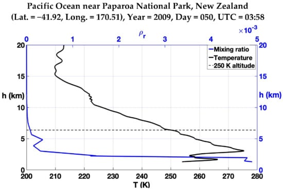Mixing ratio profile (blue) and temperature profile (black) from an RO event colocated with a radiosonde excursion. The 250 K threshold altitude for air temperature is also plotted.
