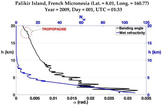 Rao et al. [] noted that the bending angle profiles usually show an irregular or a “random walk” pattern in correspondence of the tropopause and of water vapor as well (see Figure 7). While in [] an algorithm was set for a “radio tropopause altitude” definition, no analogous rule was given concerning water vapor appearance.