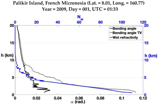 Bending angle (black), total variation of bending angle  (dotted black) and wet refractivity  (blue) profiles from the same event in Figure 6. Total variation deviates from  in correspondence with an increase in wet refractivity.