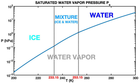 An accurate prediction of the saturated water vapor pressure in the atmosphere is not an easy task, given the various elements to take into consideration: water drop radius dimensions/ice crystal structures, supercooled metastable state of water, salt and aerosol concentrations, and so on (see [,] for more details). As a preliminary study we will consider the following equation, relating  with the temperature :