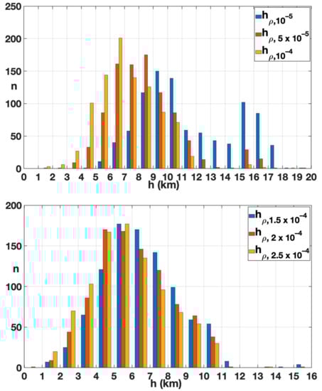 Distribution histograms for the dry air starting altitudes , ,  (top) and , ,  (bottom). Means and standard deviations for these distributions are reported in Table 2.