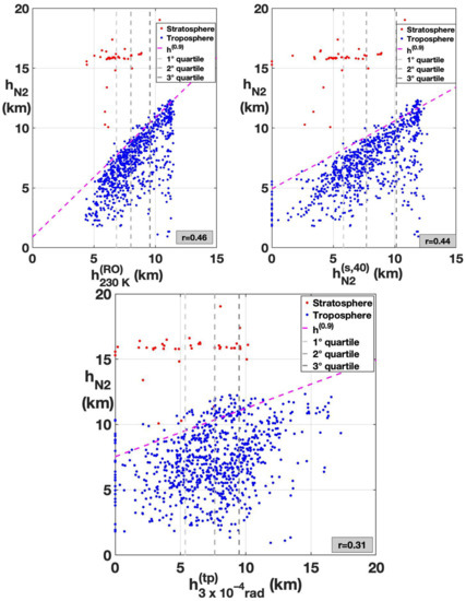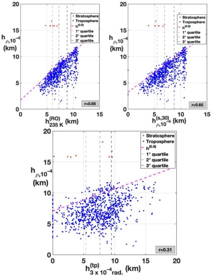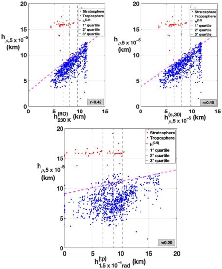 Scatterplots among the dry air starting altitudes  and the three best estimators  (top left),  (top right) and  (bottom). Correlation coefficients (r) are reported bottom right, for each graph. Red points denote starting altitude falling in the stratosphere, blue points in the troposphere. Purple broken lines denote the  straight lines, while grey broken lines the estimators’ quartiles.
