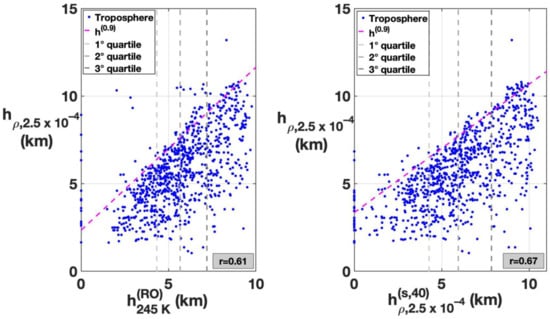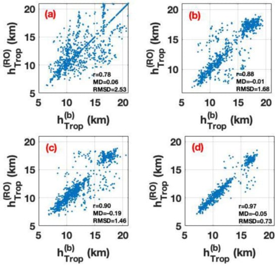 For all these locations we determined the altitudes , ,  by RO observations and  and  from radiosonde excursions data. Concerning the former quantities, we calculated their mean deviation (MD), the root mean square deviation (RMSD) and the correlation coefficients with respect to the latter ones. For the dry air starting altitudes , , ,  and , we determined the best estimators among the three families of altitudes , ,  here considered, by varying ,  and, respectively, (for  we consider both the cases  and ). For the lower starting altitudes , and , concerning the greatest values of mixing ratio here considered, estimations were not performed with the  altitudes, the selected values of  being too low for a good approximation. The best estimators were selected by requiring that the sum of the RMSD with the absolute value of the MD was minimum (at parity of this sum, those with the highest correlation coefficient): we also calculated the coefficients  of their linear regressors, with the relative RMSDs.