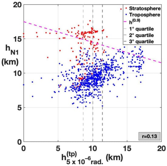 Scatterplots among the dry air starting altitudes  and the three best estimators  (top left),  (top right) and  (bottom). Correlation coefficients (r) are reported bottom right, for each graph. Red points denote starting altitude falling in the stratosphere, blue points in the troposphere. Purple broken lines denote the  straight lines, while grey broken lines the estimators’ quartiles.